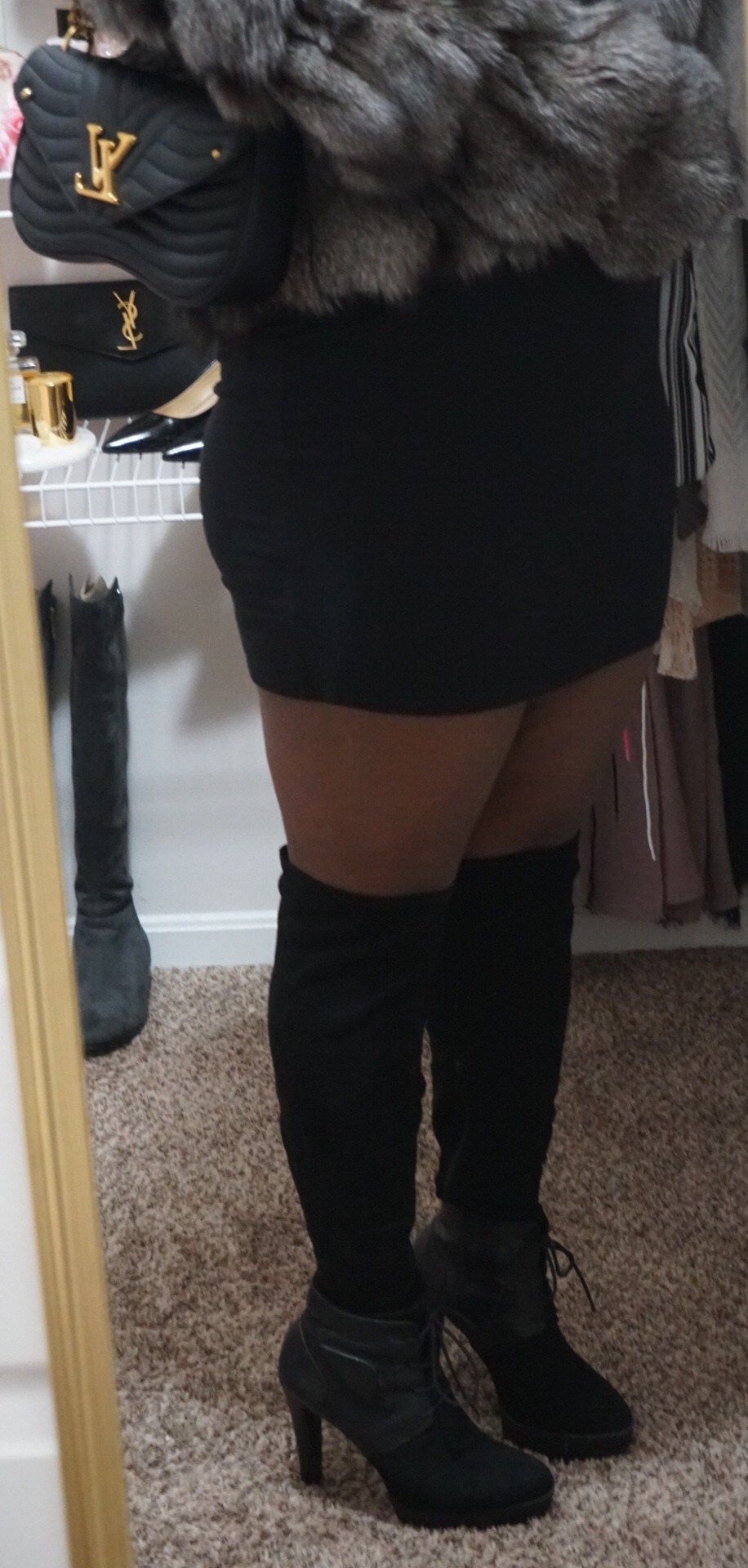 I purchased these boots on sale at Kohl’s quite some time ago. I’m a sucker for black, over the knee boots. I think the lace detail on this pair is fun and unique. I’m not sure if Jennifer Lopez is still selling clothing, so I’m glad I snagged these. Along with this fur, they’re a winter must have.