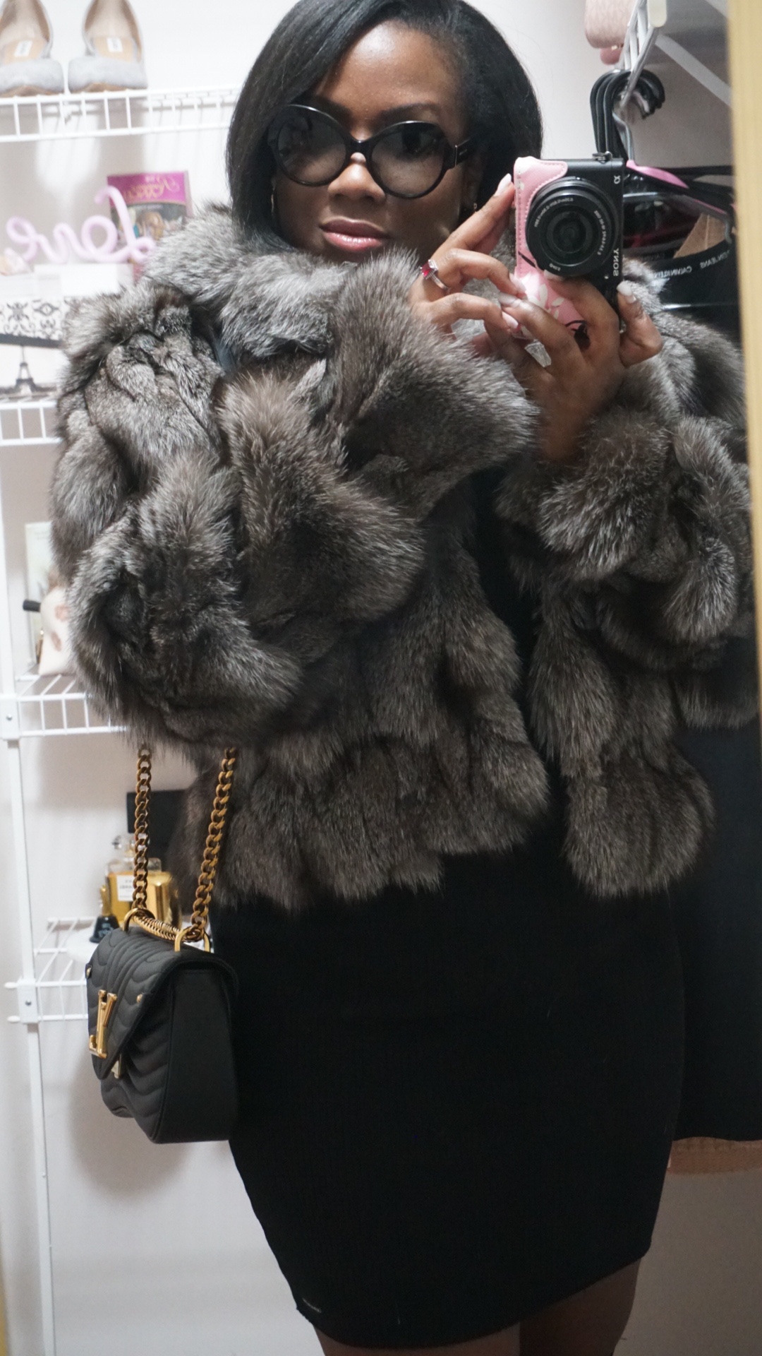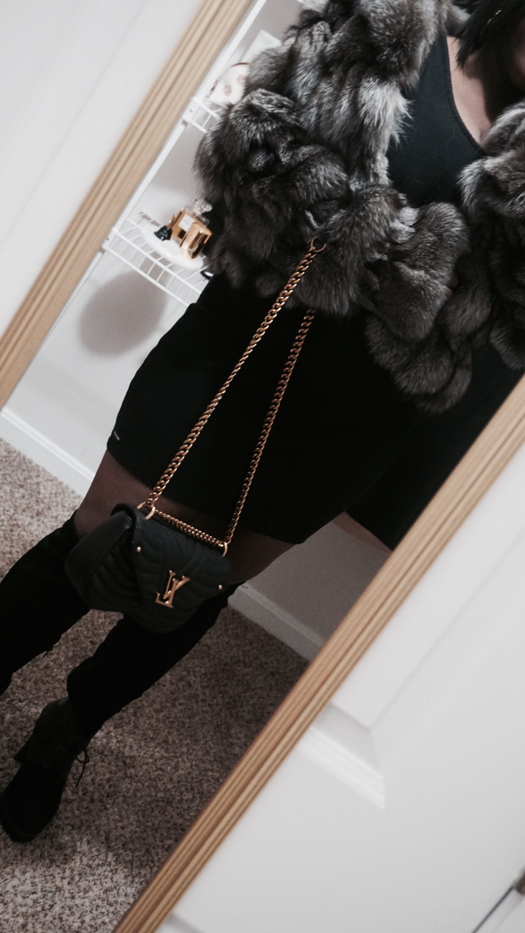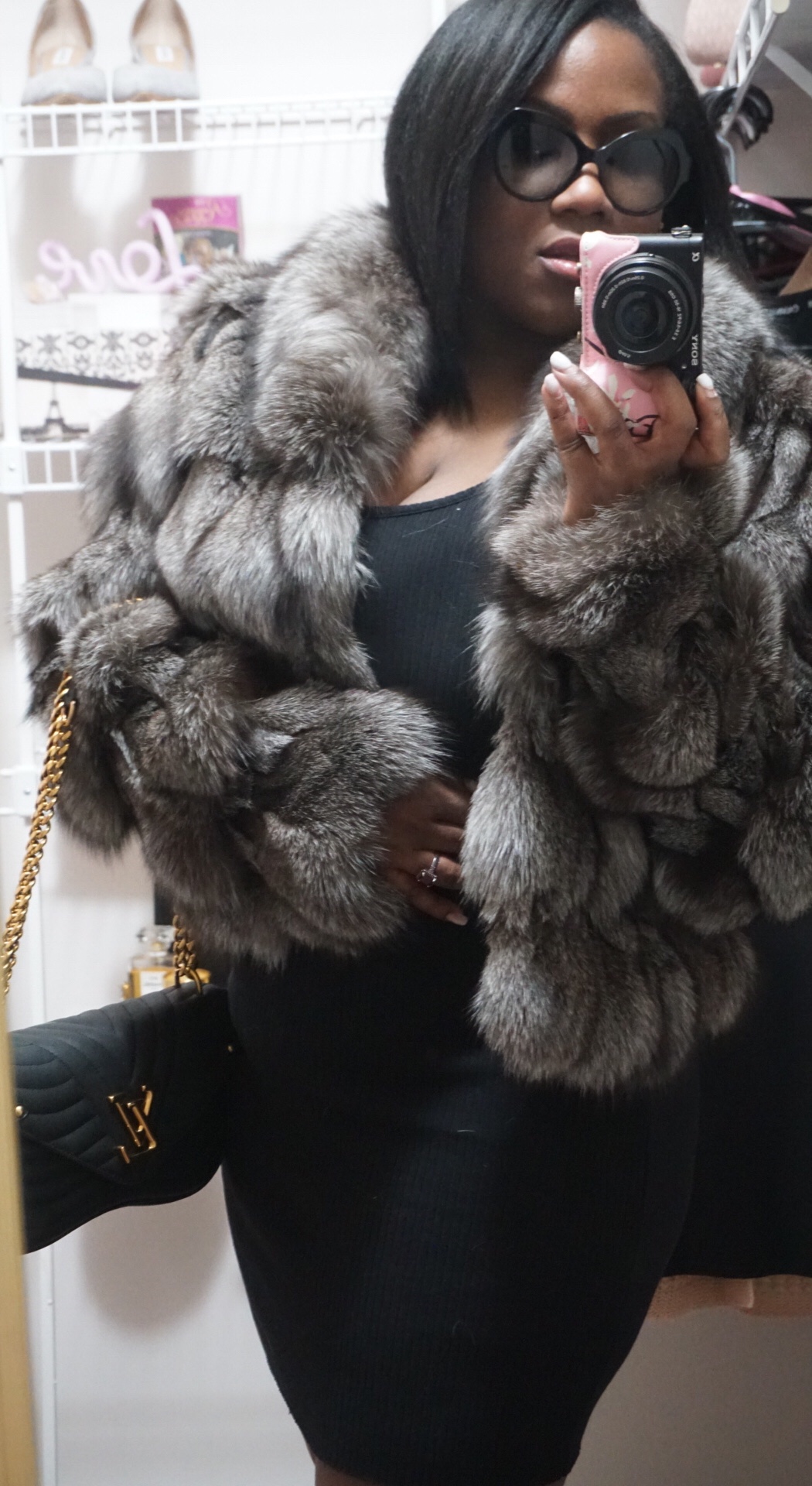 I never leave the house without it. It has replaced every other bag I own. I can’t get enough. I find new ways I want to wear it all the time. Today, I’m wearing it without the handle. The crook of my arm or long shoulder carry are my modes of choice, when I’m wearing my fur.
