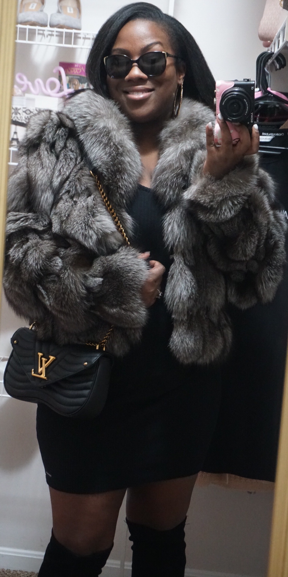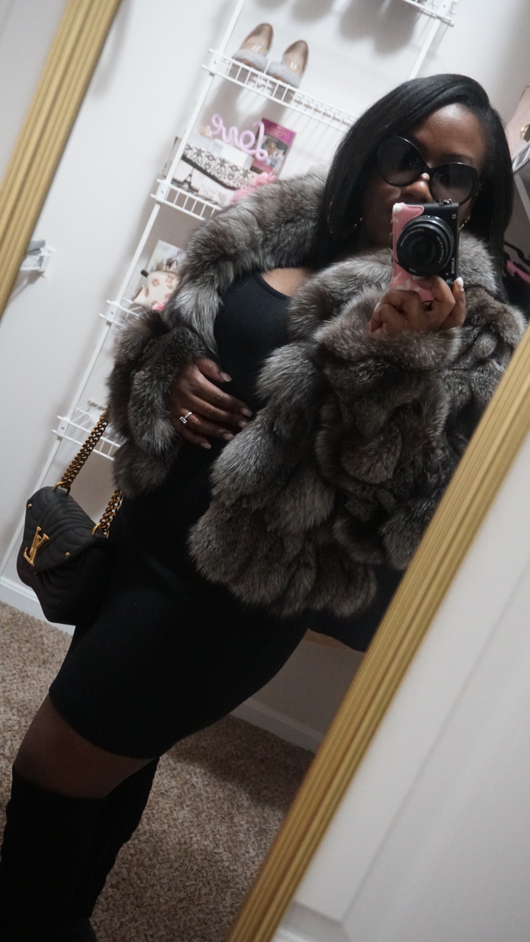 Let’s face it; I’m a soon-to-be soccer mom. I also want to feel like Jlo when I leave the house. Thus, I paired this LBD with: chunky, gold earrings from Guess; my fur coat; and my much loved pair of JLo, high heel boots. Mission accomplished.
