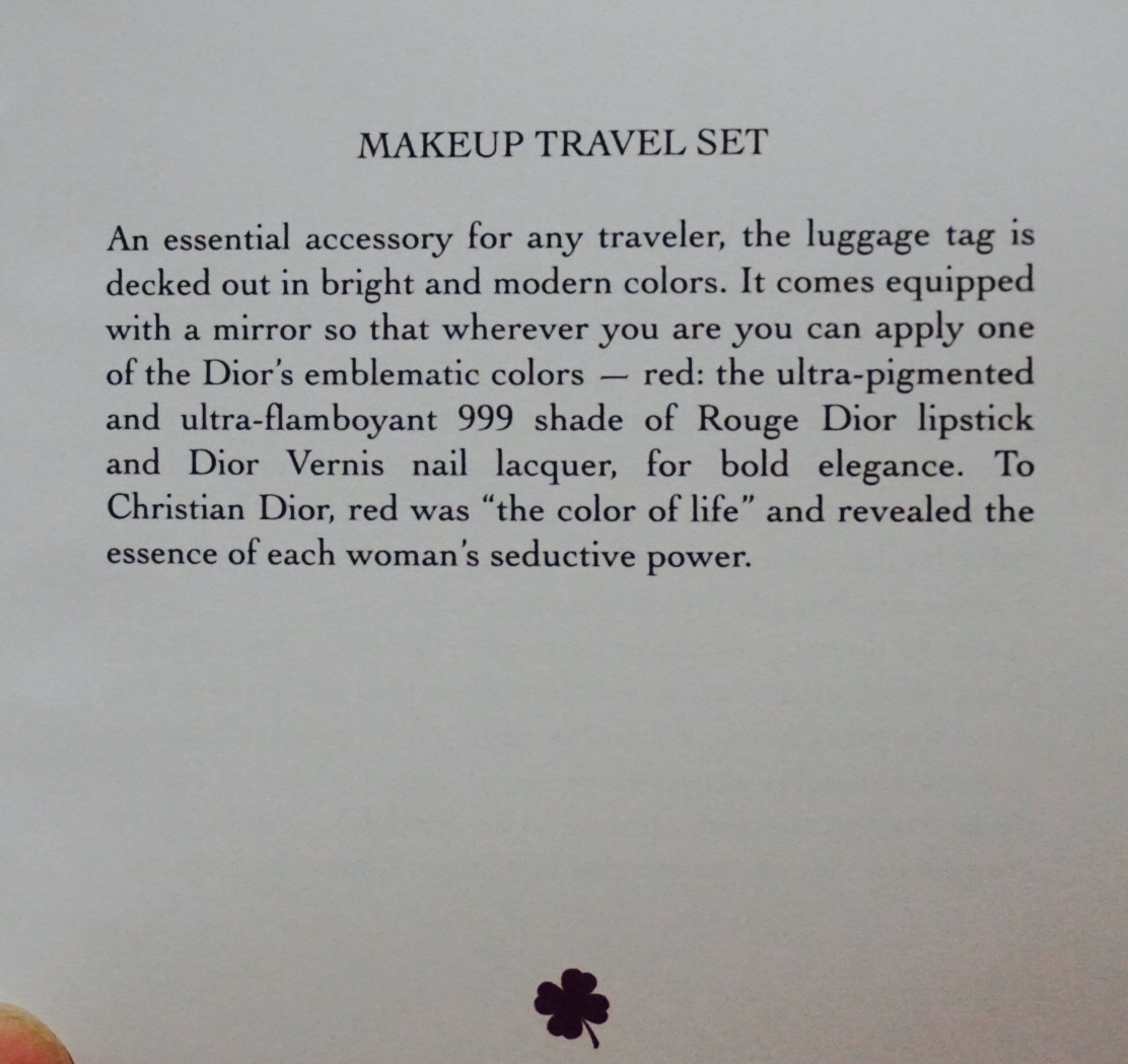 Rouge 999 is a Dior classic. This gift set includes the shade in a travel nail polish along with a travel lipstick in a satin finish. Cute luggage tags were a part of the set as well. This was a fun surprise.