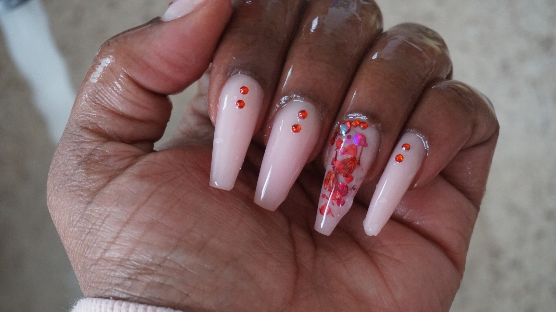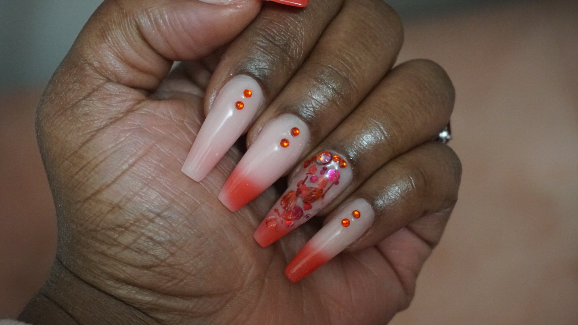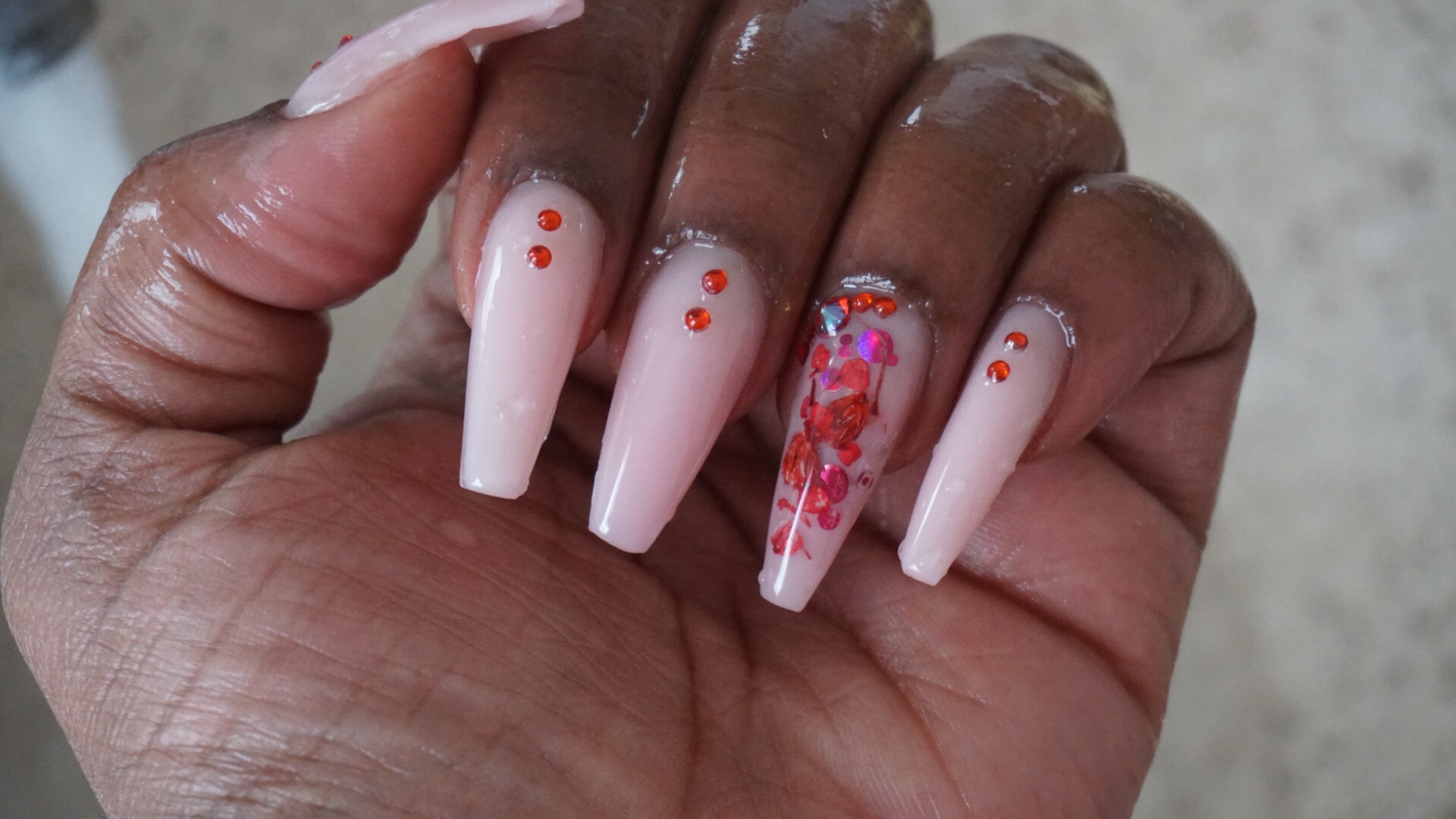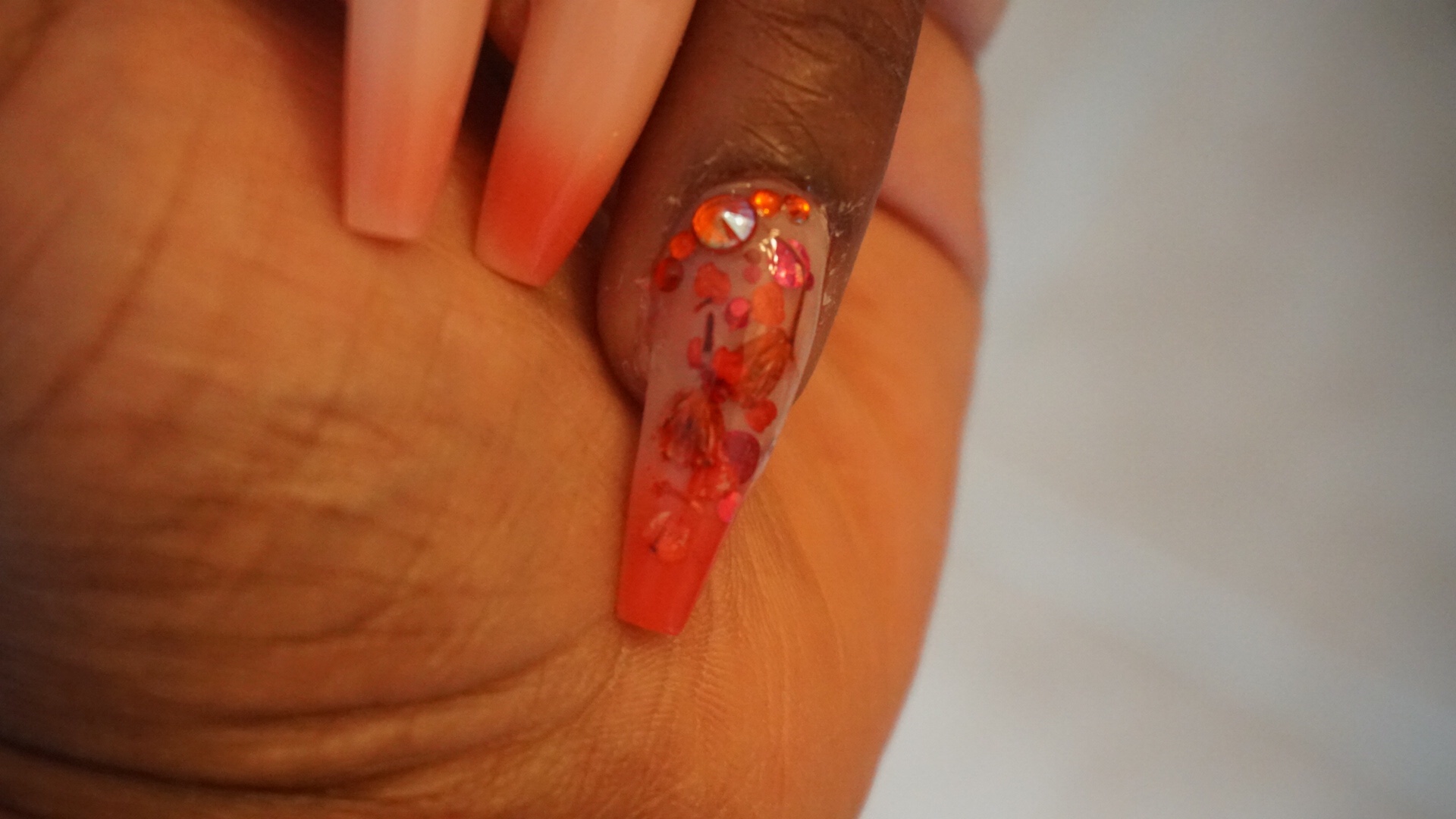 I used three different methods to accomplish this set: thumbnails were crafted using dual forms, I sculpted a few with nail forms, and the Femi Beauty #LazyGirlMethod helped me achieve the gorgeous ring fingernails. The Femi Beauty Method is the easiest method for encasing nail art with hybrid gel. Here, I’ve used real, dried flowers and chunky, holographic glitter to create these stunning accent nails. For the finishing touch, I added red AB stones. I’m in love with this nail look. No pun intended.