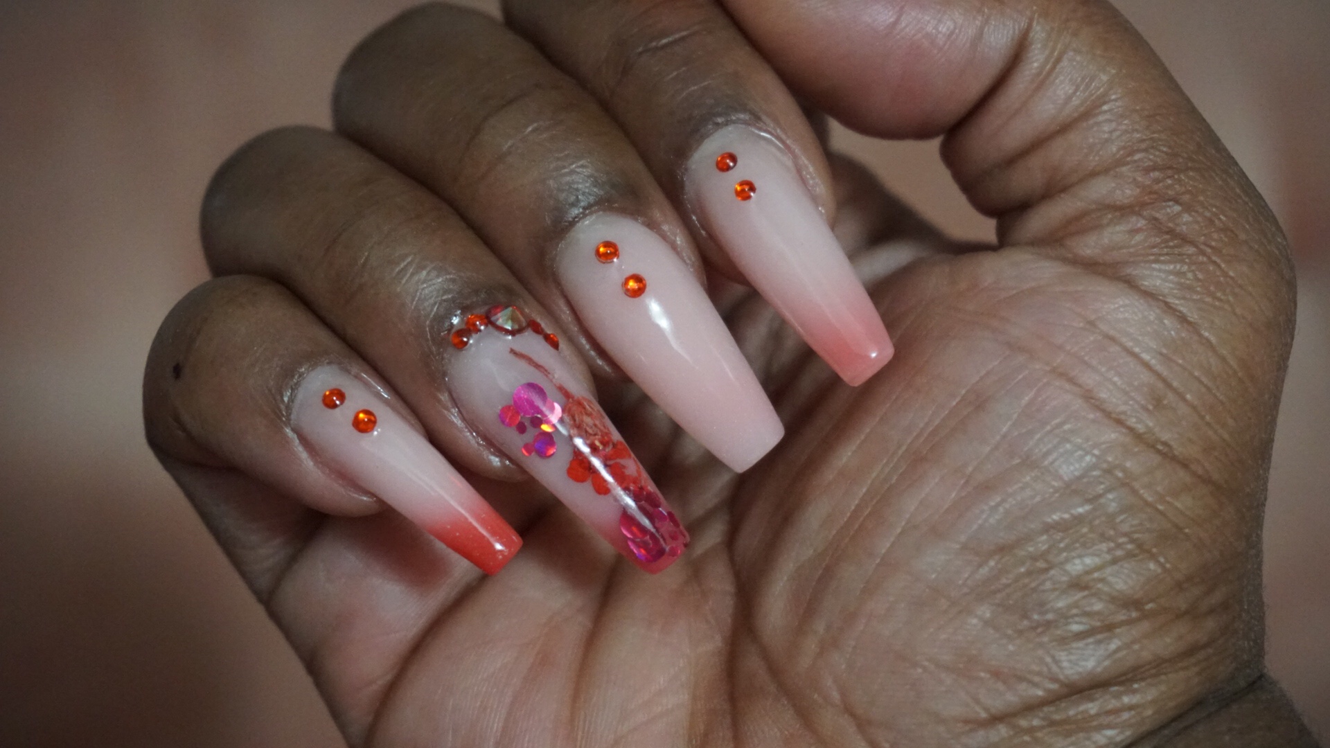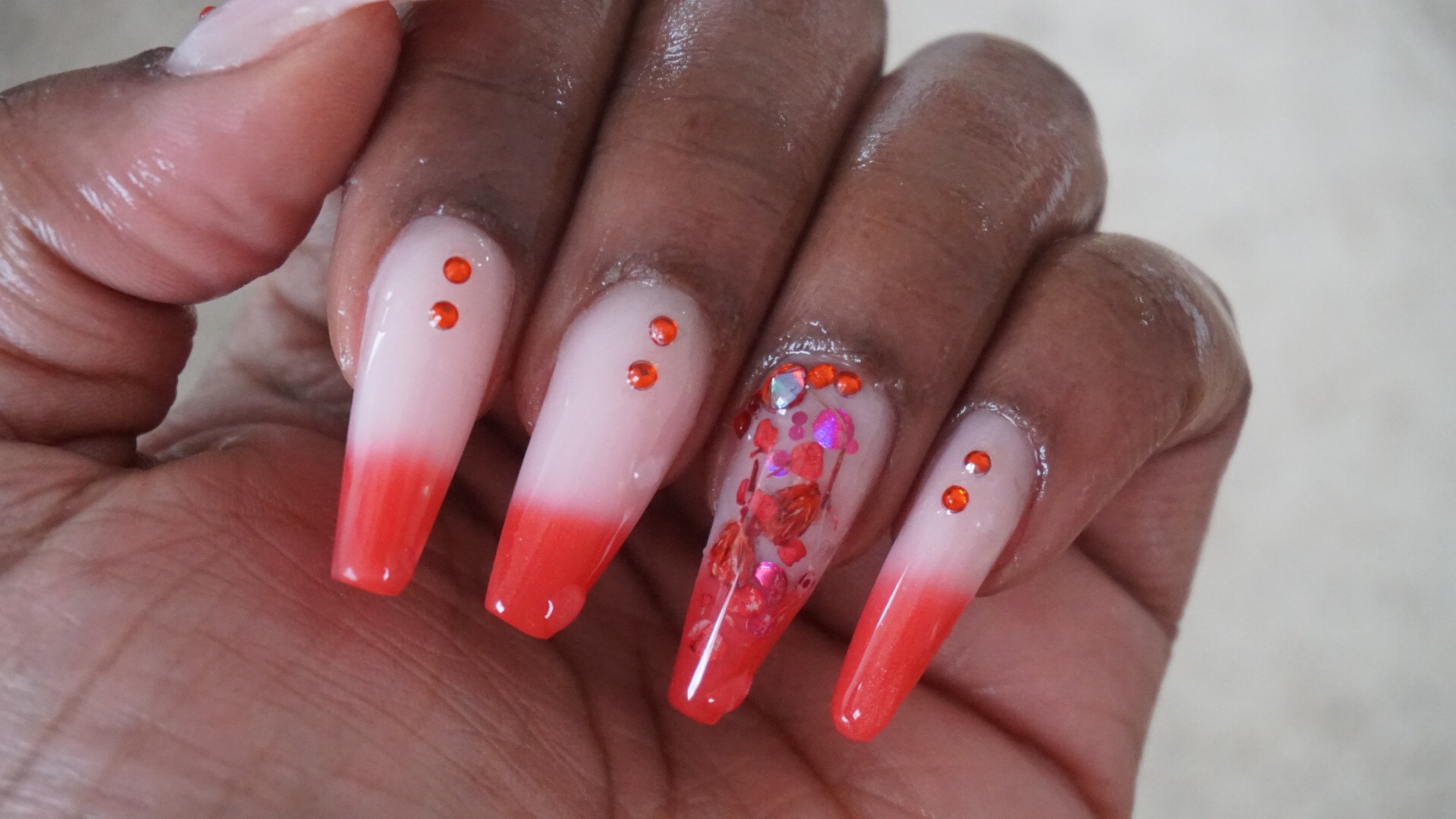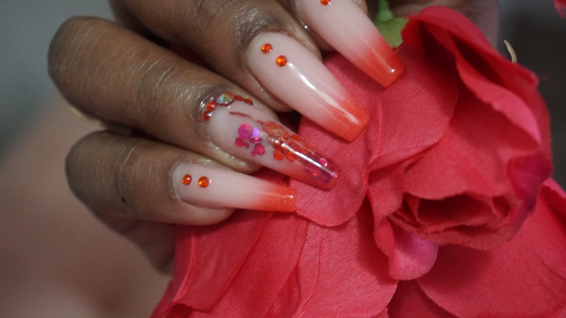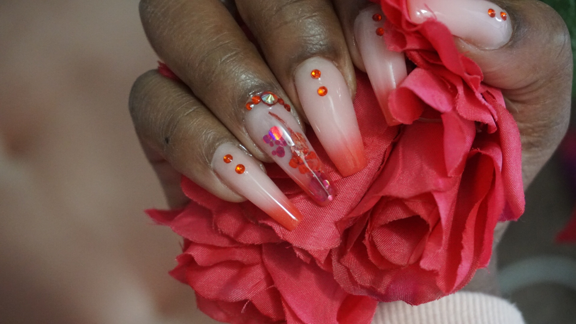 I used three different methods to accomplish this set: thumbnails were crafted using dual forms, I sculpted a few with nail forms, and the Femi Beauty #LazyGirlMethod helped me achieve the gorgeous ring fingernails. The Femi Beauty Method is the easiest method for encasing nail art with hybrid gel. Here, I’ve used real, dried flowers and chunky, holographic glitter to create these stunning accent nails. For the finishing touch, I added red AB stones. I’m in love with this nail look. No pun intended.
