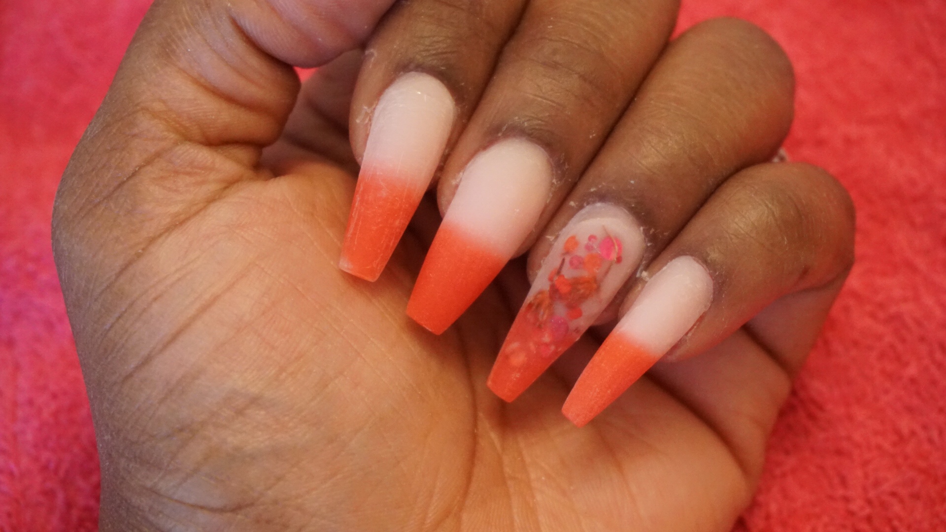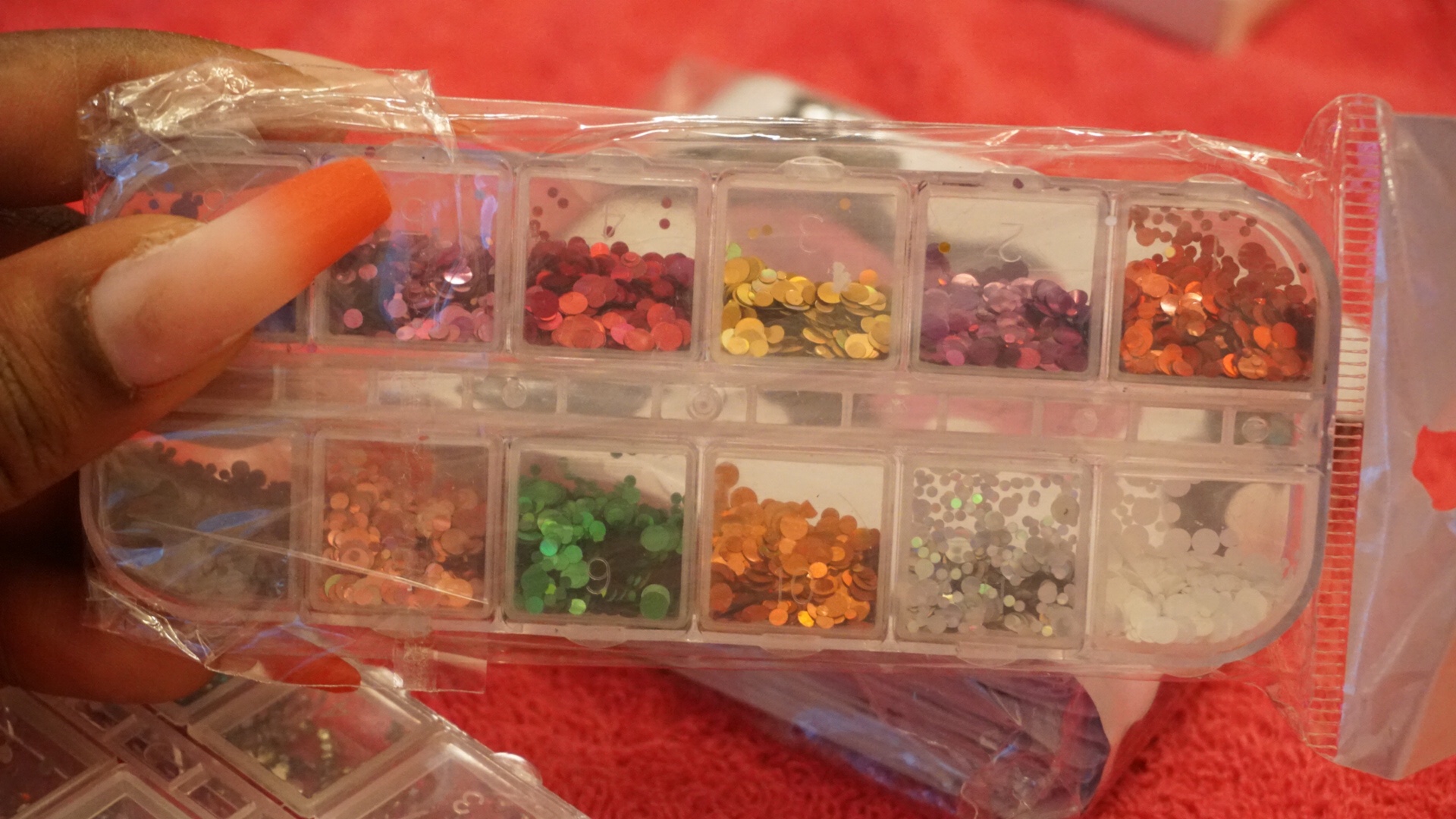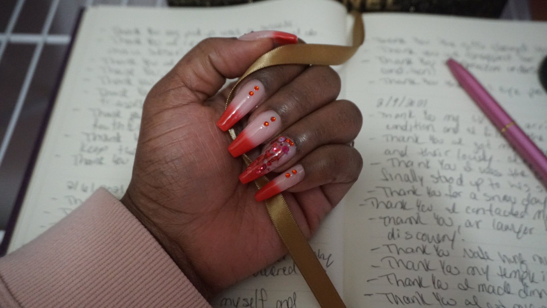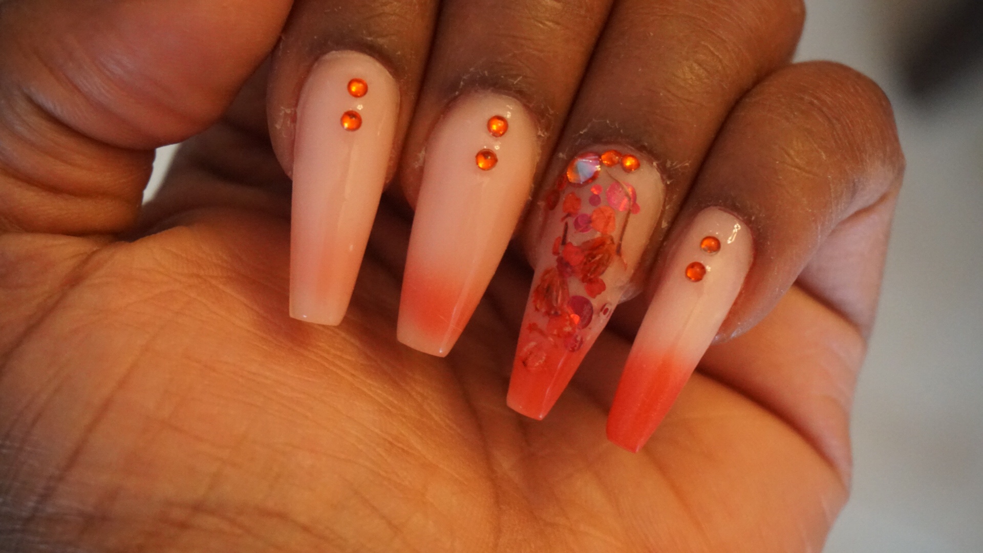 I used three different methods to accomplish this set: thumbnails were crafted using dual forms, I sculpted a few with nail forms, and the Femi Beauty #LazyGirlMethod helped me achieve the gorgeous ring fingernails. The Femi Beauty Method is the easiest method for encasing nail art with hybrid gel. Here, I’ve used real, dried flowers and chunky, holographic glitter to create these stunning accent nails. For the finishing touch, I added red AB stones. I’m in love with this nail look. No pun intended.
