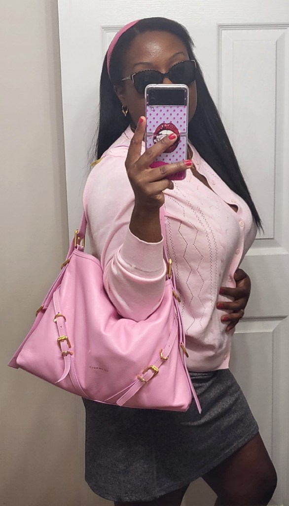Hard-core #Barbiecore! That is my chant and motto of the season. This spring, I purposed to commit to the pink bag to make my Barbiecore fantasies a dream come true. I pulled it off with my latest Givenchy picks, including the Voyou bag in Silk Pink. I call this look “Librarian Barbie.”