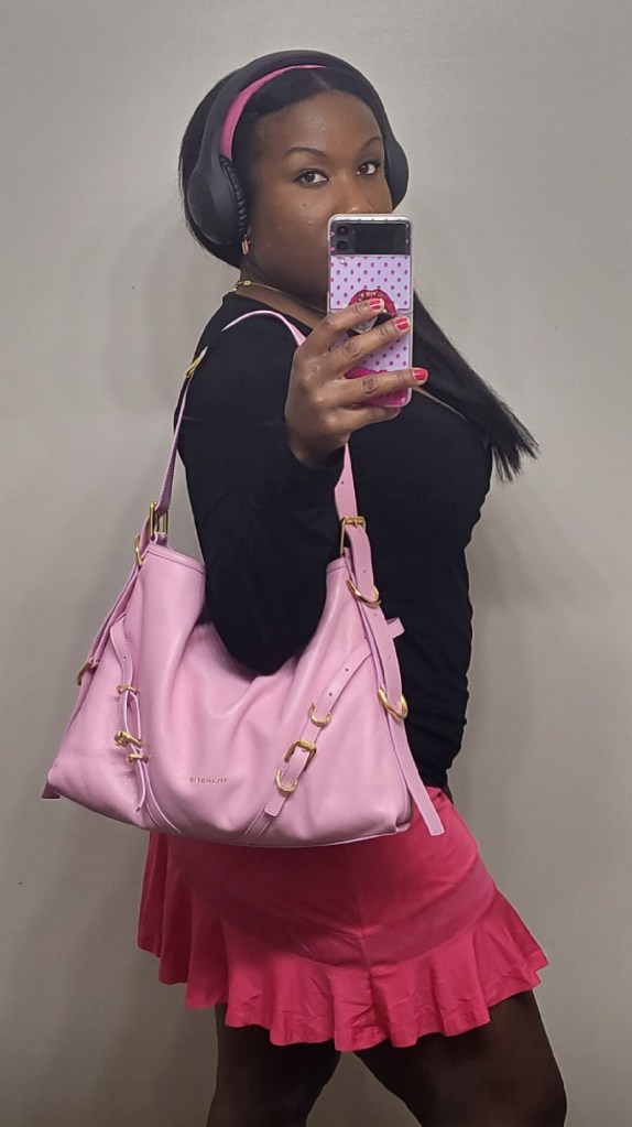 This Voyou handbag from Givenchy is my new favorite. The seasonal “silk pink” color gives me major Barbie vibes, and even though this is the medium size, its large capacity fits everything I need for an evening out with my newly three year old. It’s the perfect bag for when family night and date night meet.