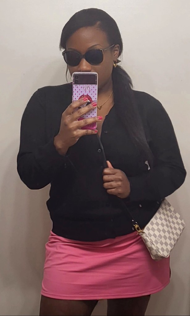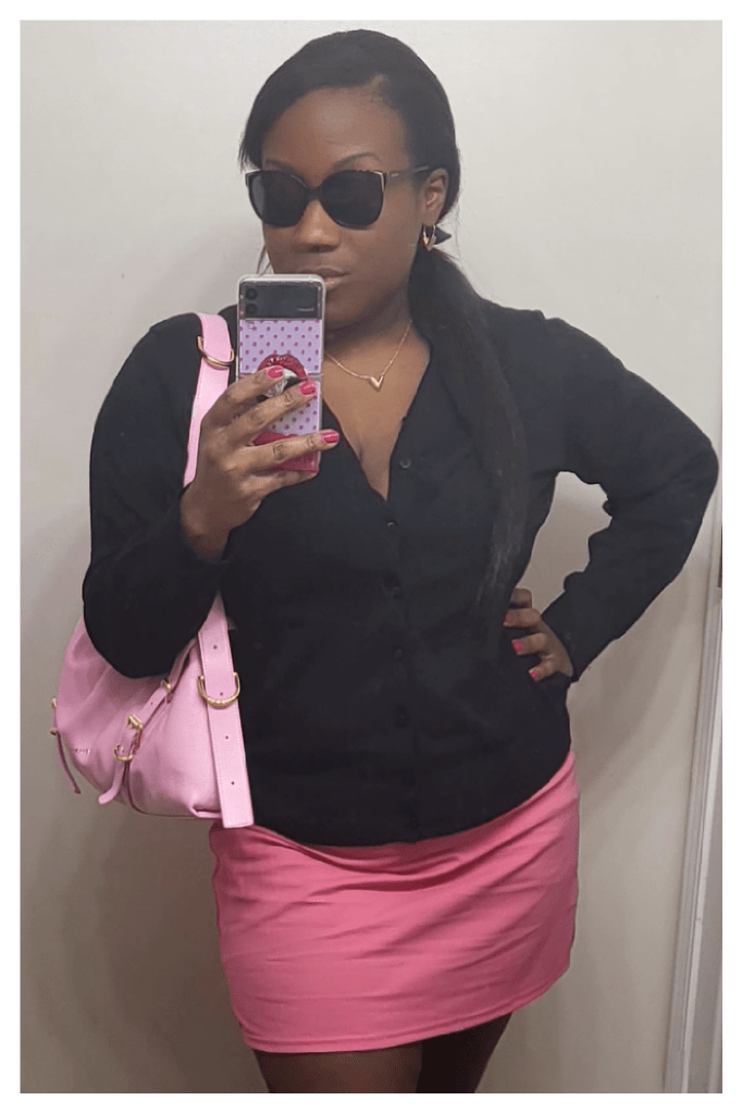 We may not all be as stunning as our favorite musical icons, but we can always take some inspiration from them! I call this look “Blackpink” for obvious reasons. It’s a simple black cardigan paired with a basic, pink golf skirt. Yet, as usual, adding a few of my favorite luxury accessories made me feel as fashionable as a pop star.